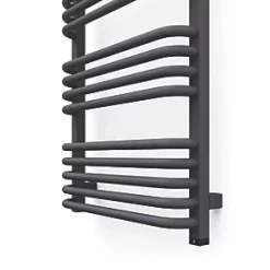 Electric towel radiator with LCD display showing energy consumption. 9 adjustable programmes and a top-mounted thermostat. Uses a dry technology system. Offers flexibility with adjustable fixing rails. IP24 rated.