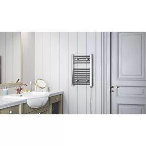 Electric towel rail supplied with the entry-level Terma SIM heating element, with a small, discreet stainless steel head and 1 fixed heat setting of 65°C to regulate the internal radiator temperature. Compatible with external timer. Glossy chrome finish to perfectly complement many bathroom accessories. Power supply controlled from switched fused spur (no power button on the element itself). As the rail is flat, it can be flipped so the element is on the left. Supplied with grey cable.
