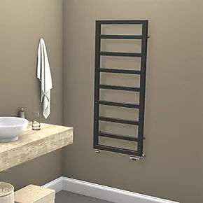 Square profile designer towel radiator with a textured black powder-coated finish. Features sturdy 40mm bars for strong output and style. Compliments square bathroom fittings.