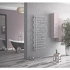 Designer towel radiator with curved tubes. Steel construction with a high quality chromating.